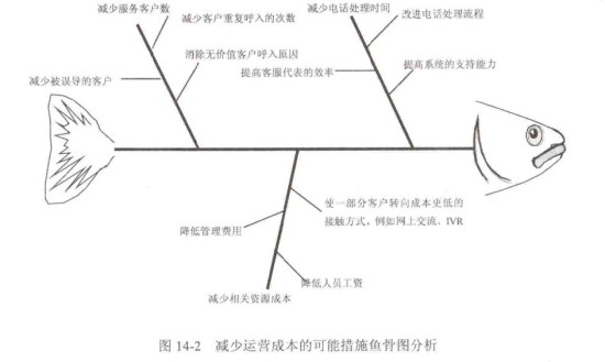 這三個(gè)方面是客戶服務(wù)中心減少運(yùn)營(yíng)成本的基本出發(fā)點(diǎn),做成本控制措施分析時(shí)一定要從這三方面出發(fā)。當(dāng)然,只知道這三個(gè)方面還不行,還應(yīng)進(jìn)一步做具體分析。做具體的成本控制措施分析時(shí),有時(shí)候要用到一些必要的工具,比如魚(yú)骨圖之類的。一步一步細(xì)分,盡可能地把每一個(gè)可能的措施都找出來(lái)。圖14-2就是一個(gè)可能措施分析的例子。