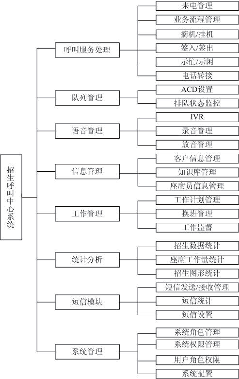 招生呼叫中心中心系統(tǒng)包括考生信息管理,生源的追蹤與管理,自助語音導(dǎo)航(IVR)、知識(shí)庫系統(tǒng)和短信收集和發(fā)送等功能模塊。招生呼叫系統(tǒng)功能模塊可由以下結(jié)構(gòu)層次組成。