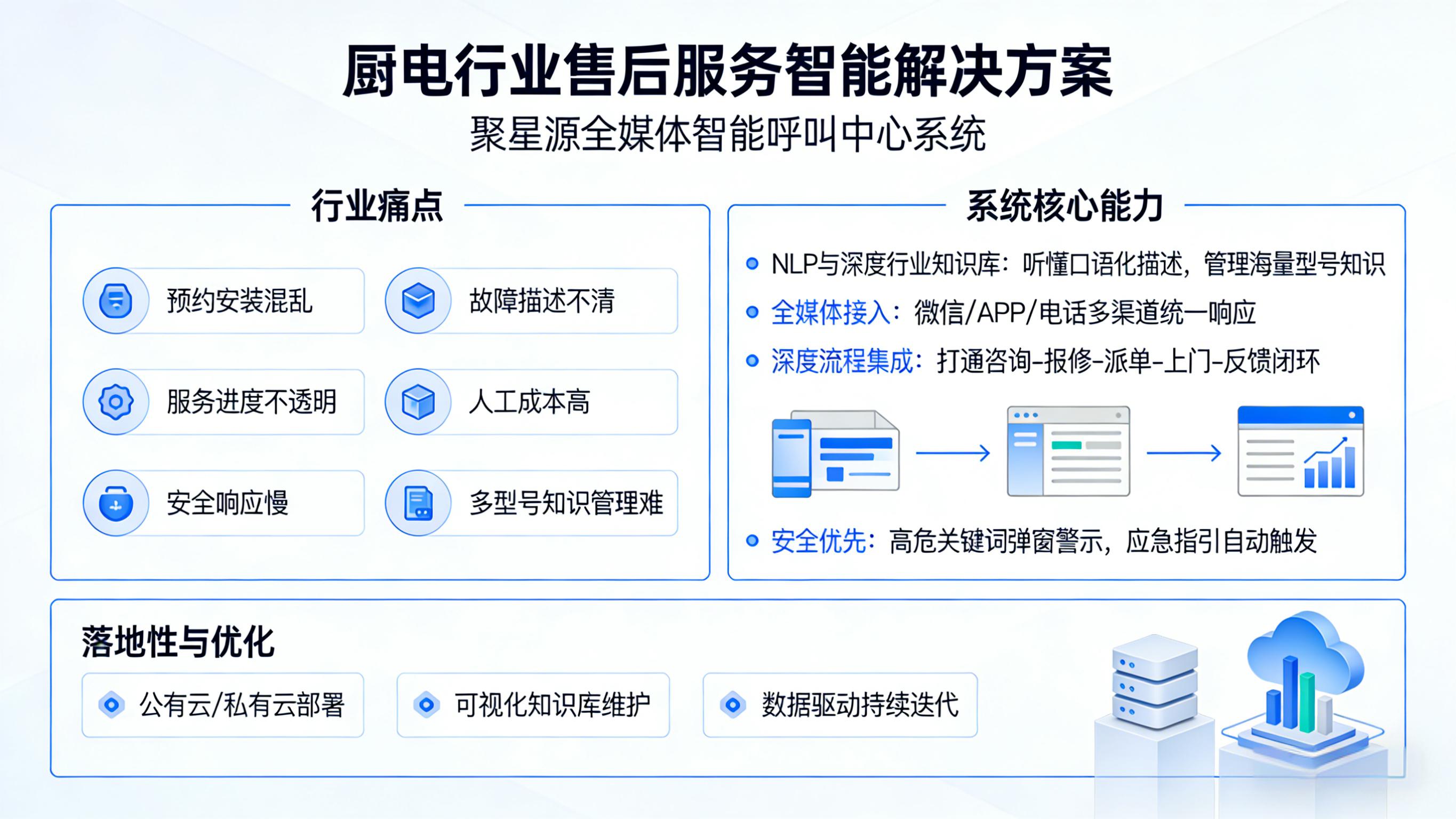 作為深耕客服領域多年的服務商,聚星源在家電制造業擁有豐富的實施和服務經驗。我們深刻理解從咨詢到上門服務的全流程痛點,能提供貼合廚電行業的最佳實踐方案和持續的優化服務。我們的標準化+可配置方案助力客戶快速上線見效,顯著降低單次服務成本,提升用戶滿意度。