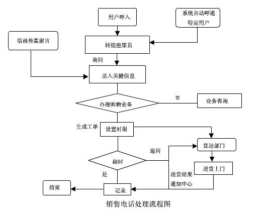 銷售電話適用于電視購物、倉儲式會員超市等。是一種新興的銷售形式如圖所示。它的特點是目標指向明確,需要涉及企業的倉儲、貨運、支付等系統。是一個典型的電子商務流程,而在這樣一個流程中,呼叫中心無疑是信息流的入口和終端。